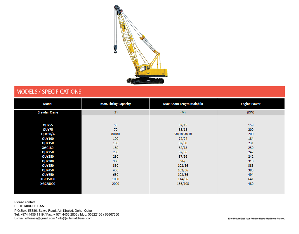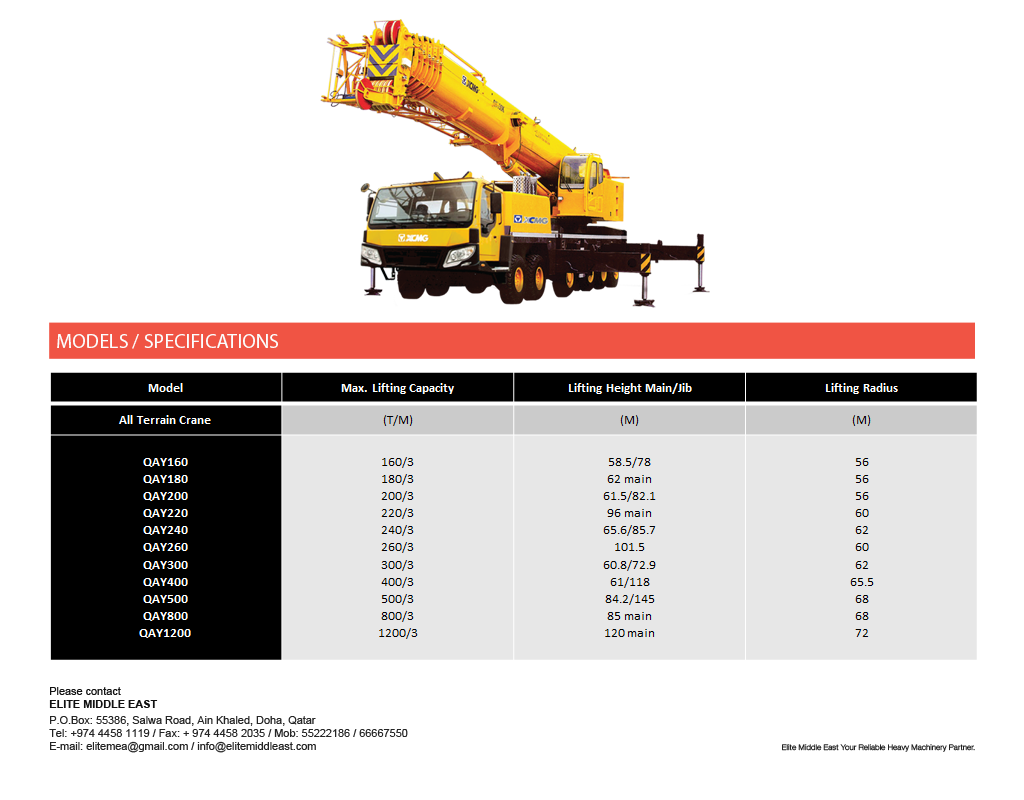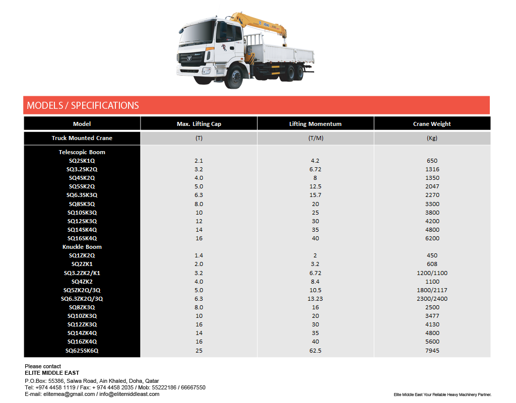 Elite Middle East Lifiting Machinery & Hydraulic Truck Crane Products PRODUCTS Lifting Machinery Download Machinery Pdf Specifications All Terrain Crane Hydraulic Truck Crane Crawler Crane Rough Terrain Crane Truck Mounted Crane Articulated and Straight Lift Scissors Lift Fork Lift ▲▼ Newsletter subscribe to our newsletter to receive news, updates,and special offers by email.