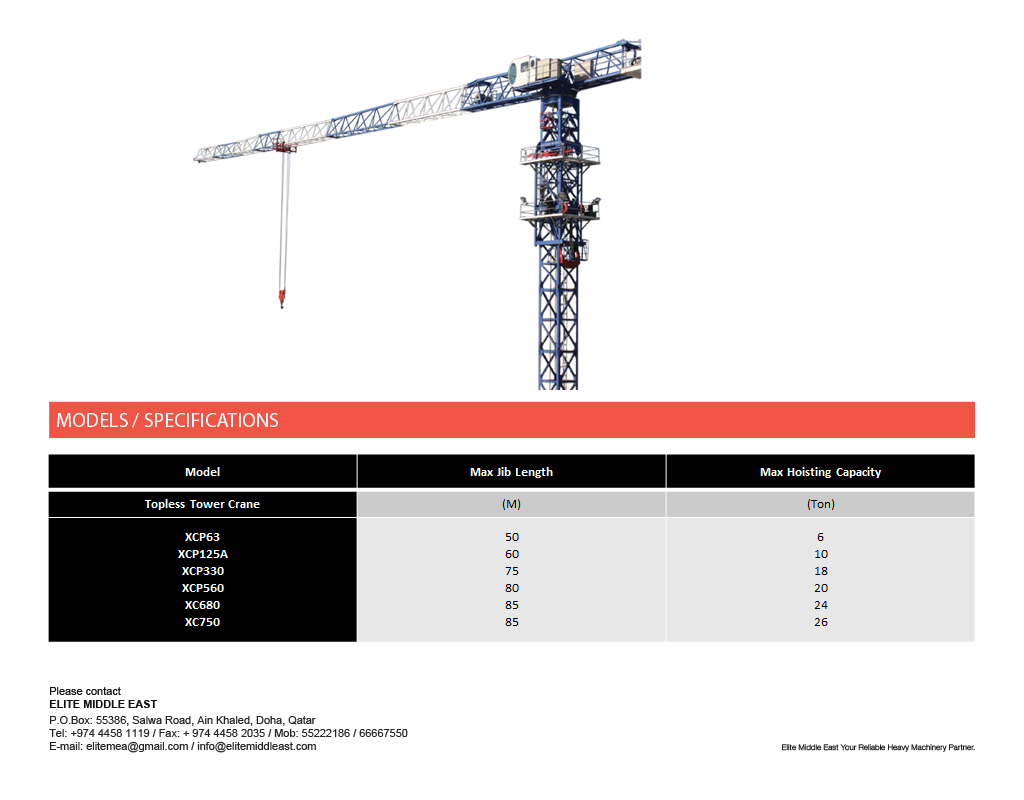 Elite Middle East Tower Cranes PRODUCTS Tower Crane Download Tower Crane Pdf Specifications Topless Tower Crane Tower Crane Construction Hoist Luffing Tower Crane ▲▼ Newsletter subscribe to our newsletter to receive news, updates,and special offers by email.